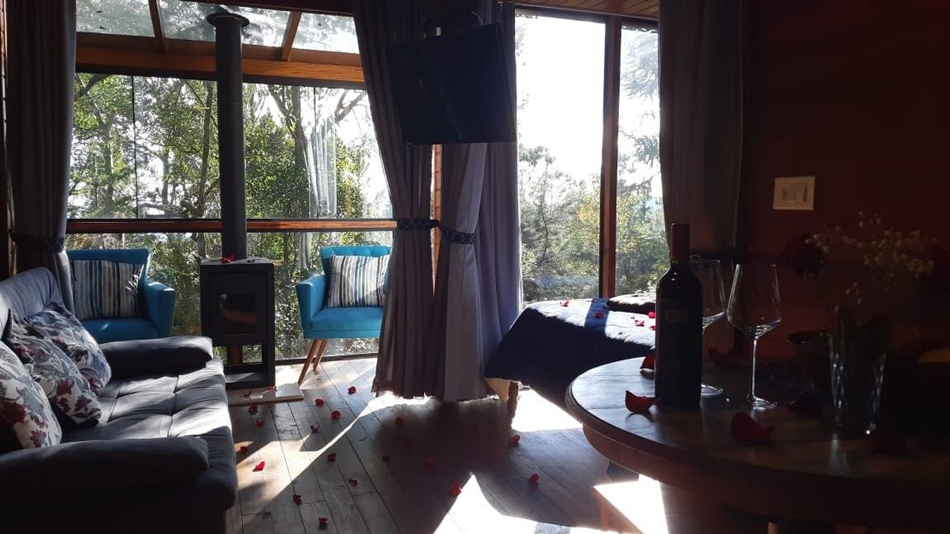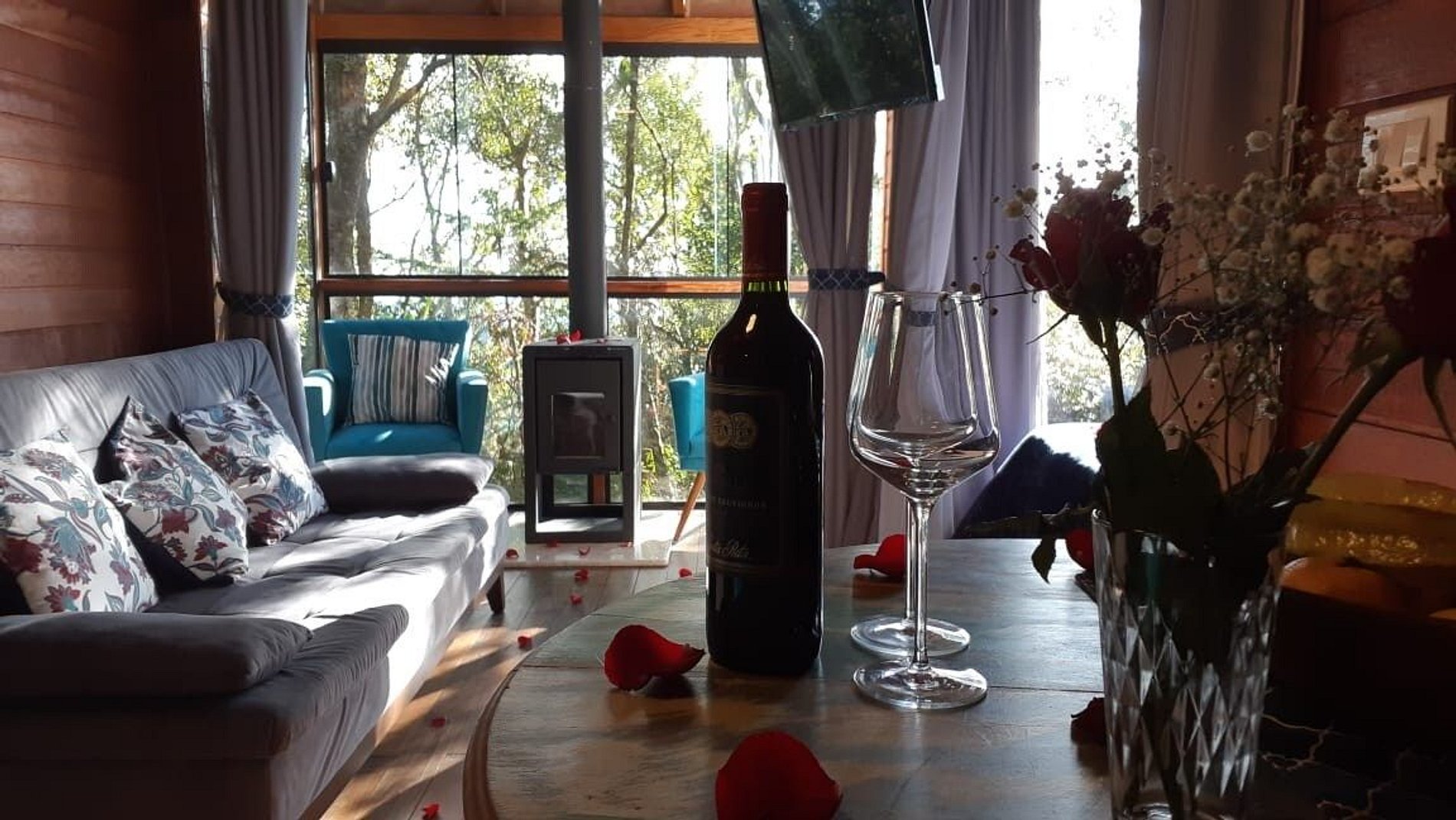 Chalé de madeira, com um aconchegante gazebo de vidro com lareira, que proporciona uma vista incrível da natureza. Possui também paredes de vidro no quarto - acorde com uma linda visão, rodeado de muito verde e ao som dos pássaros. Estamos localizados em um bairro residencial muito tranquilo. Pensamos nos mínimos detalhes para que sua estadia seja a melhor possível. Como cortesia deixamos café da manhã simples dentro do próprio chalé.