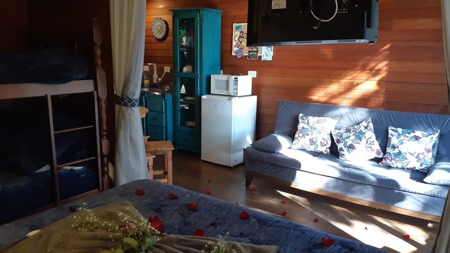 O quarto e sala são separados por cortinas, dando mais privacidade para os hóspedes.