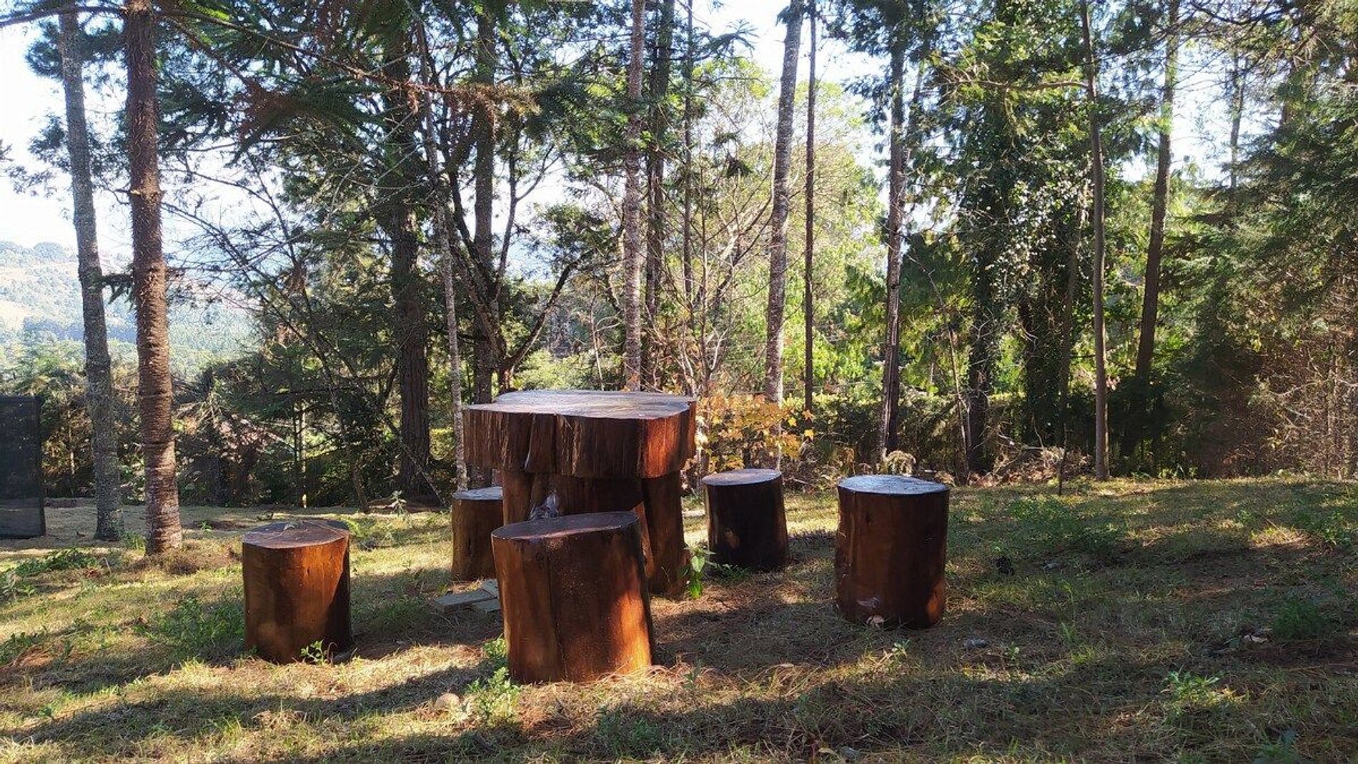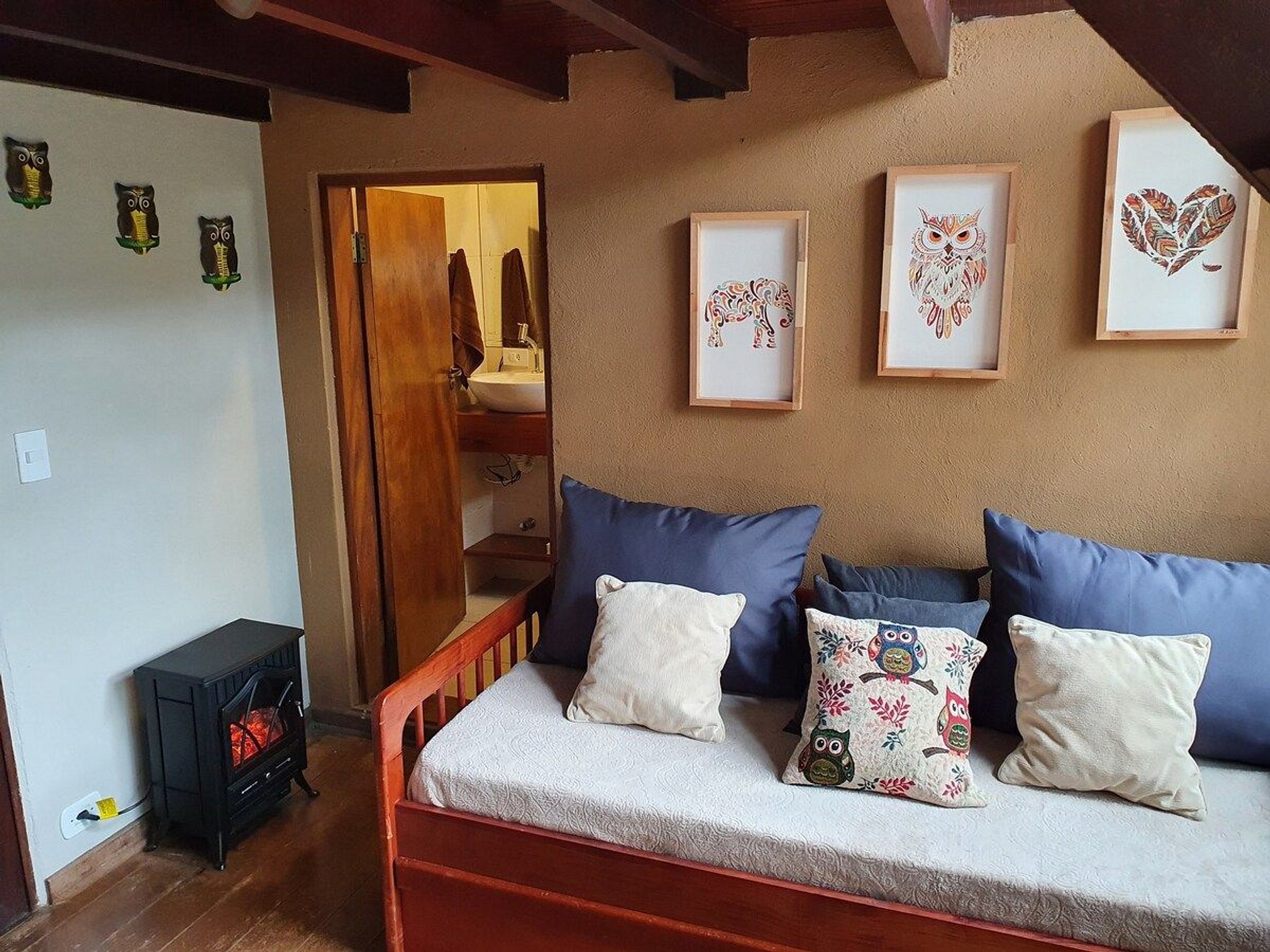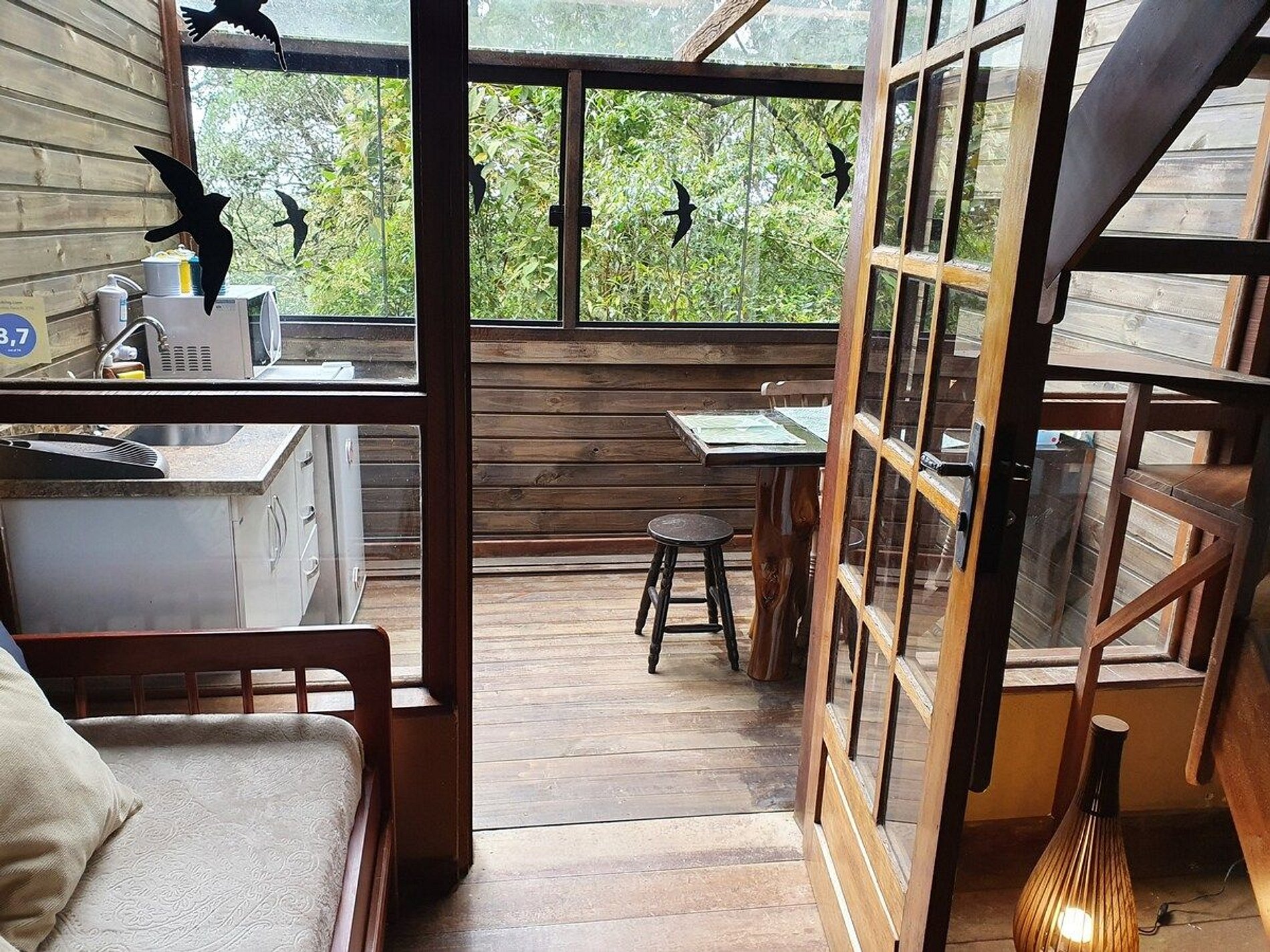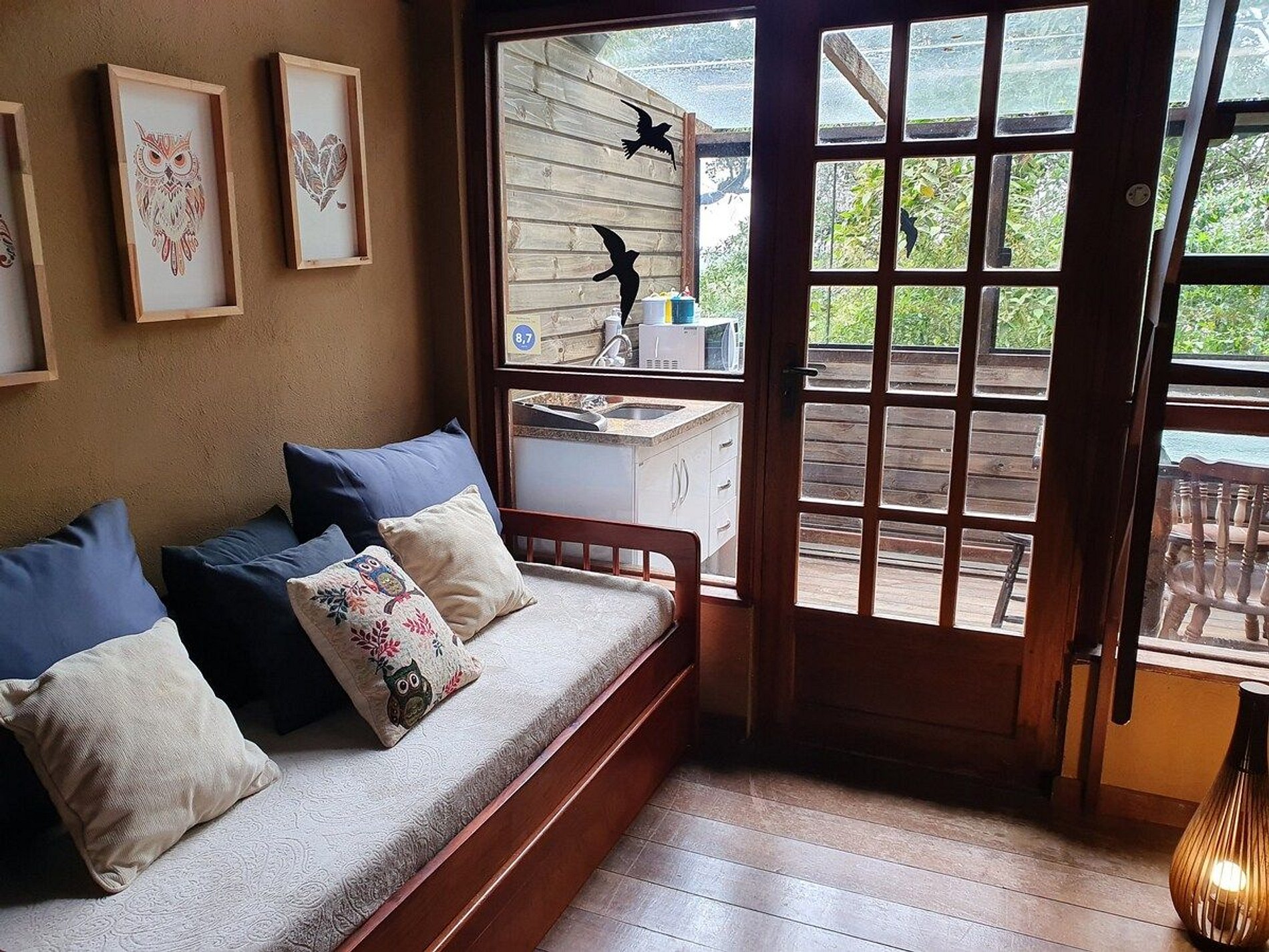Chalézinho de madeira, com uma grande janela de vidro, que proporciona uma vista incrível da natureza. Acorde com uma linda visão, rodeado de muito verde e ao som dos pássaros. Estamos localizados em um bairro residencial muito tranquilo.