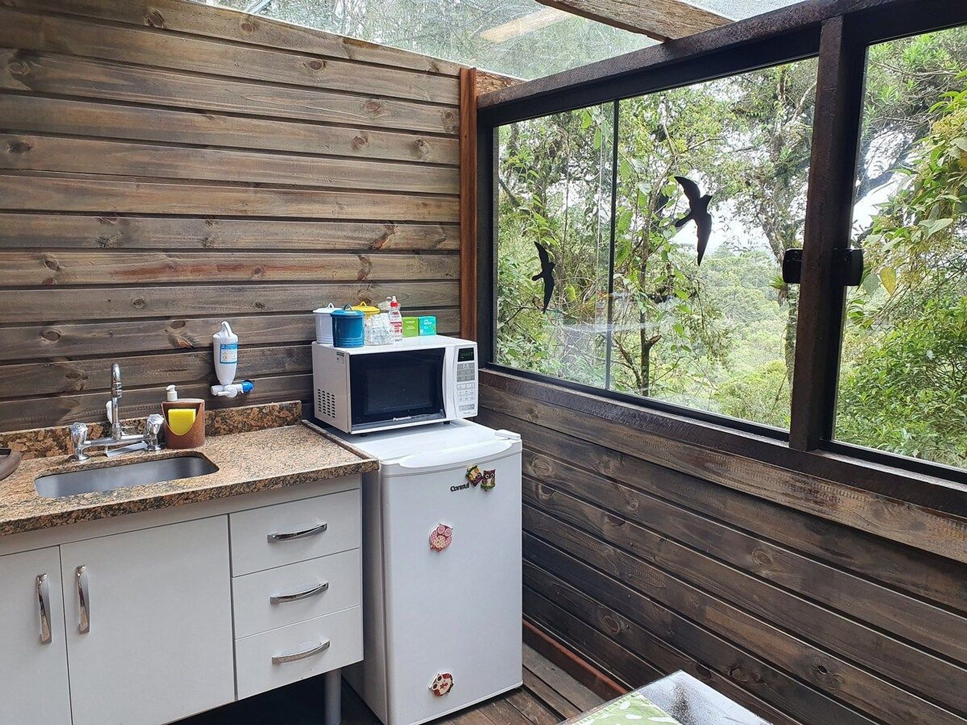 • A minicozinha dentro do chalé possui: Frigobar, cafeteira, chaleira elétrica, sanduicheira e micro-ondas. Atenção: Não há fogão!