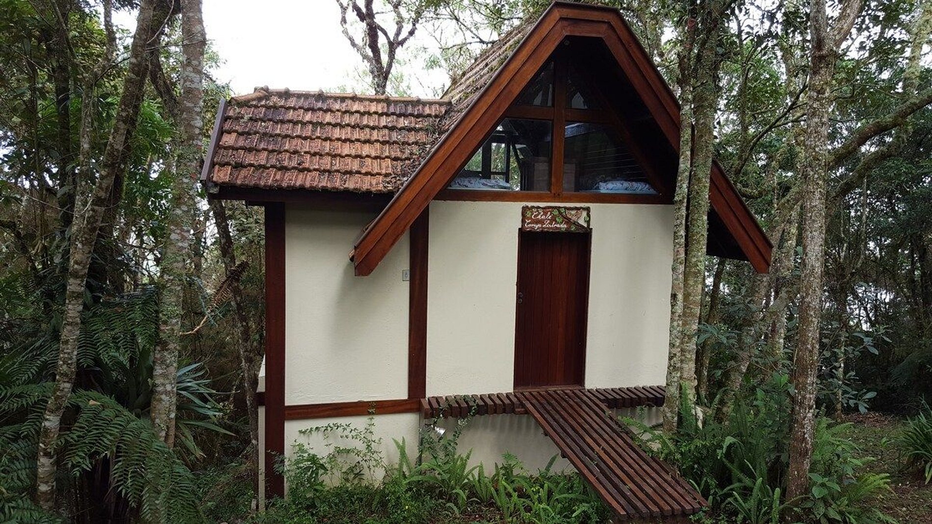 Chalézinho de madeira, com uma grande janela de vidro, que proporciona uma vista incrível da natureza. Acorde com uma linda visão, rodeado de muito verde e ao som dos pássaros. Estamos localizados em um bairro residencial muito tranquilo.